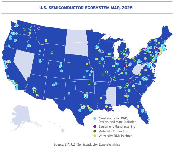 Ассоциация SEMI, как всегда в начале года, выпустила 29-страничный Отчет State of the U.S. Semiconductor Industry 20025. Один из графиков характеризует распределение объектов полупроводниковой промышленности по территории страны. Видно, что лишь в пяти штатах (Невада, обе Дакоты, З.Вирджиния и Миссисипи) они отсутствуют. В целом же, принимаемые в последние годы меры, призваны к 2032 г. утроить локальное производство полупроводников. Негосударственные инвестиции в этот процесс составляют более $500 млрд, что создаст более 500 тыс. новых рабочих мест - 68 тыс. в производстве (сейчас в отрасли занято 345 тыс. человек, из них 206 тыс. в производстве), 122 тыс. в строительстве новых Fab'ов и 320 тыс. в смежных отраслях. Расходы на R&D в отрасли составят рекордные 17,7% от объема продаж, уступая лишь фармацевтике/биотехнологиям (21,5%). Экспорт полупроводников в 2024 г. составил $57 млрд, что выводит отрасль на 6-е место после нефти, газа, самолетов и автомобилей. По оценке Ассоциации из $630,5 млрд рынка полупроводников в 2024 г., 50,4% или $318 млрд пришлись на долю компаний со штаб-квартирой в США.